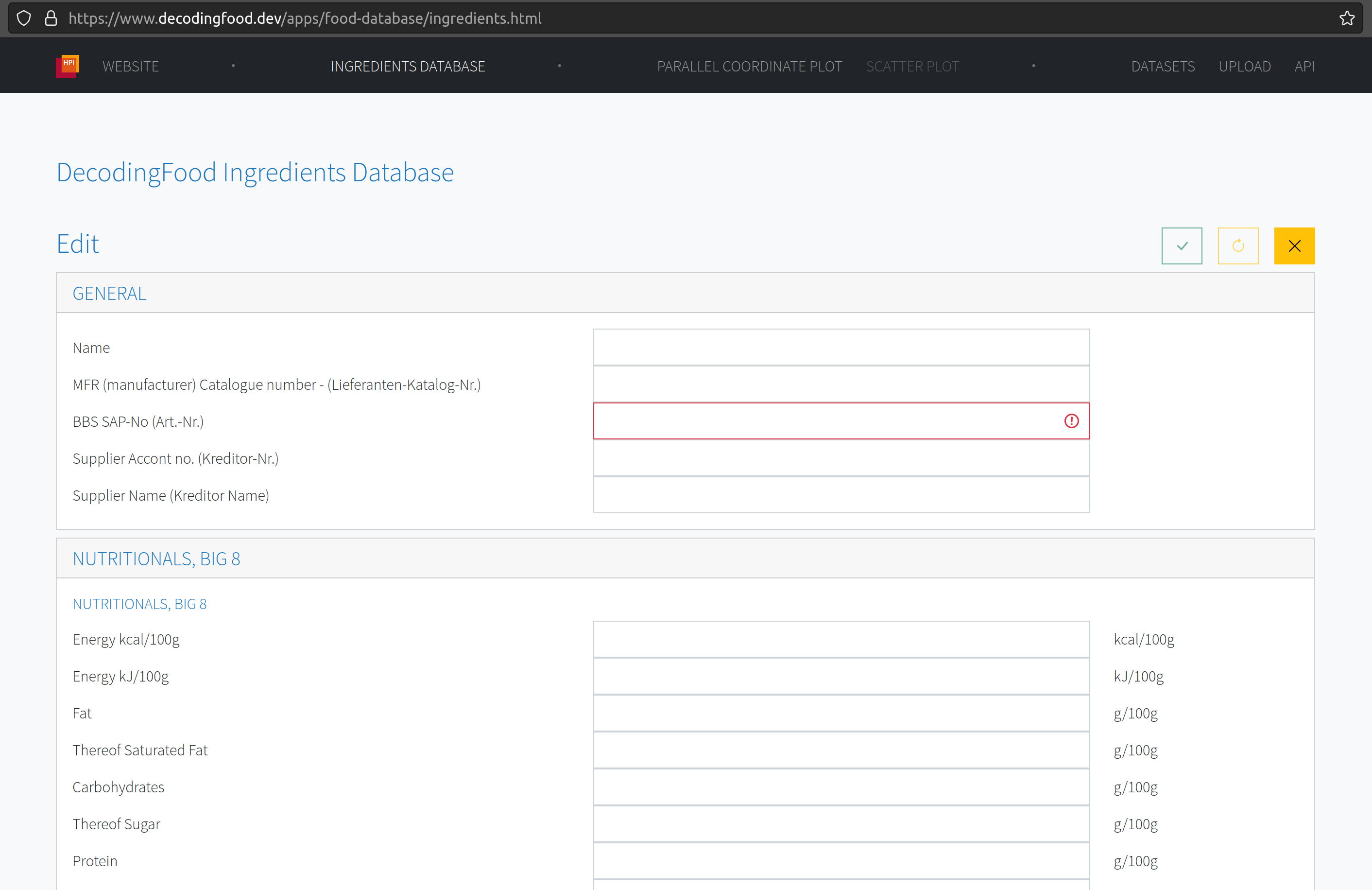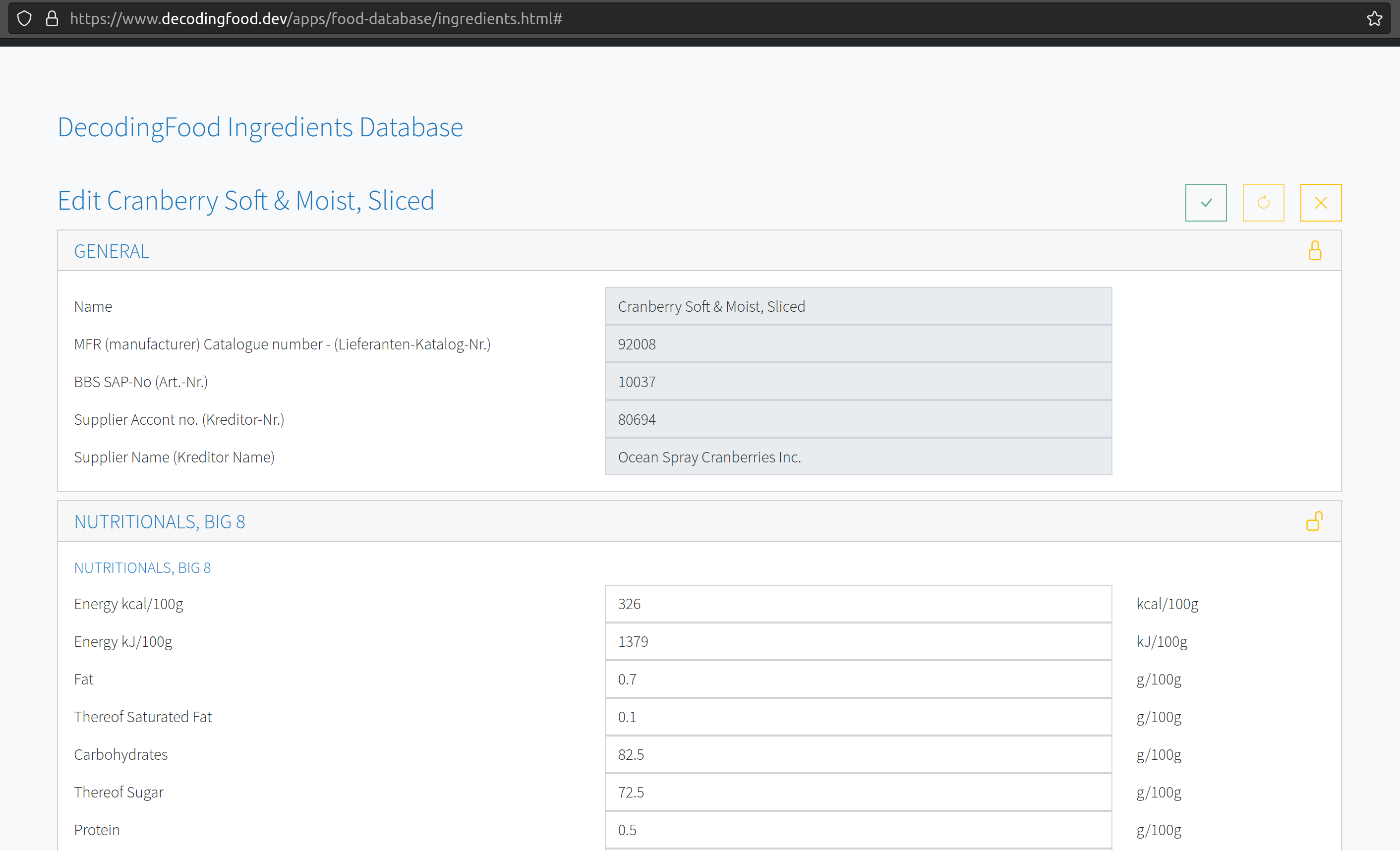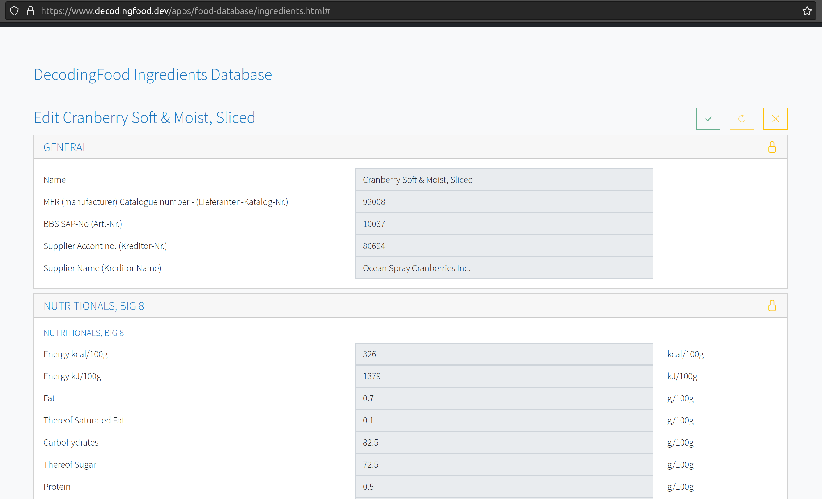 Über die gelben Schloss-Buttons können die Felder innerhalb der zugehörigen Gruppe bearbeitbar geschaltet werden. So bearbeitete Werte werden innerhalb der DecodingFood Plattform verändert, aber an keiner Stelle mit der SAP-Plattform zurück synchronisiert.