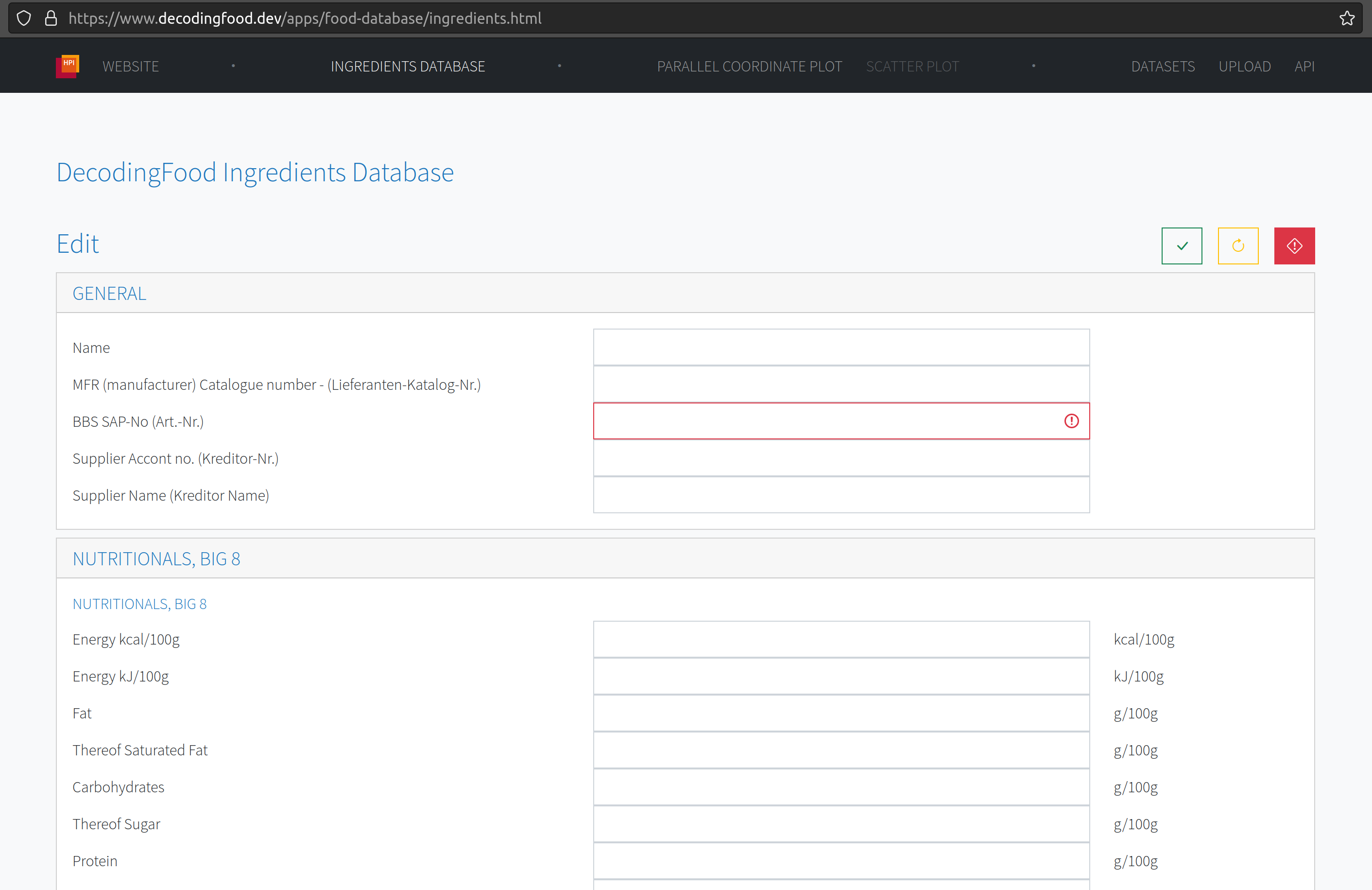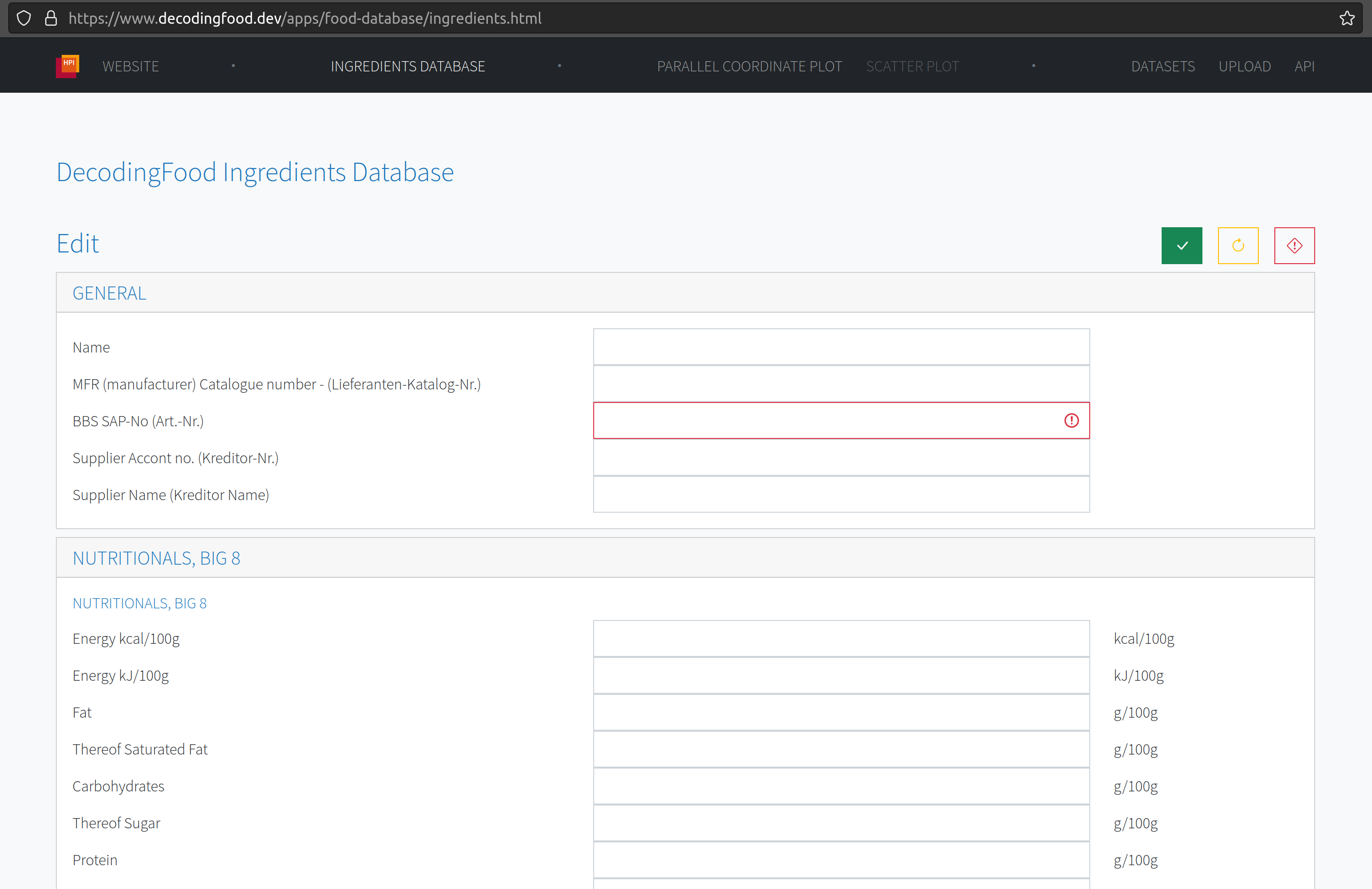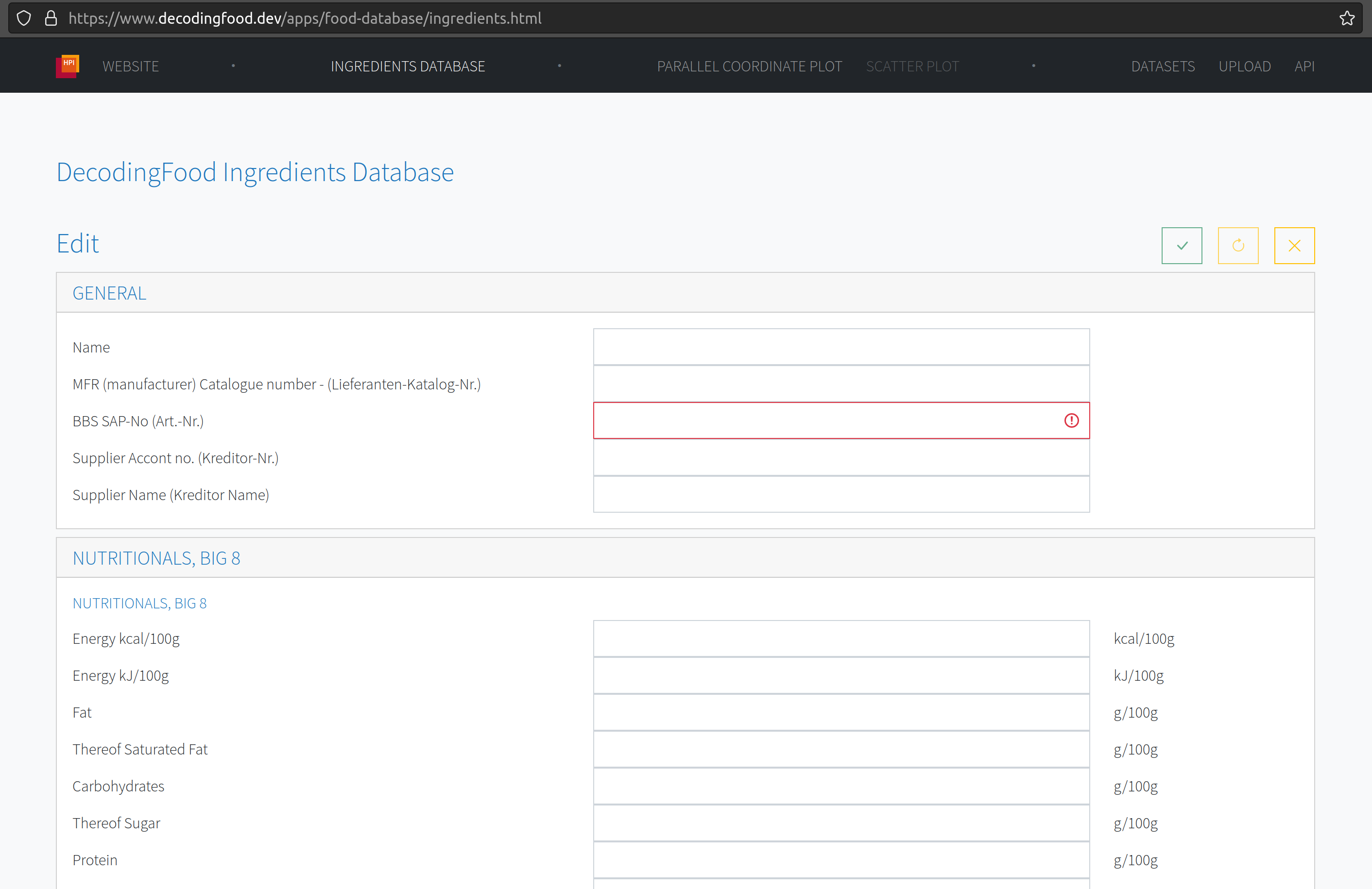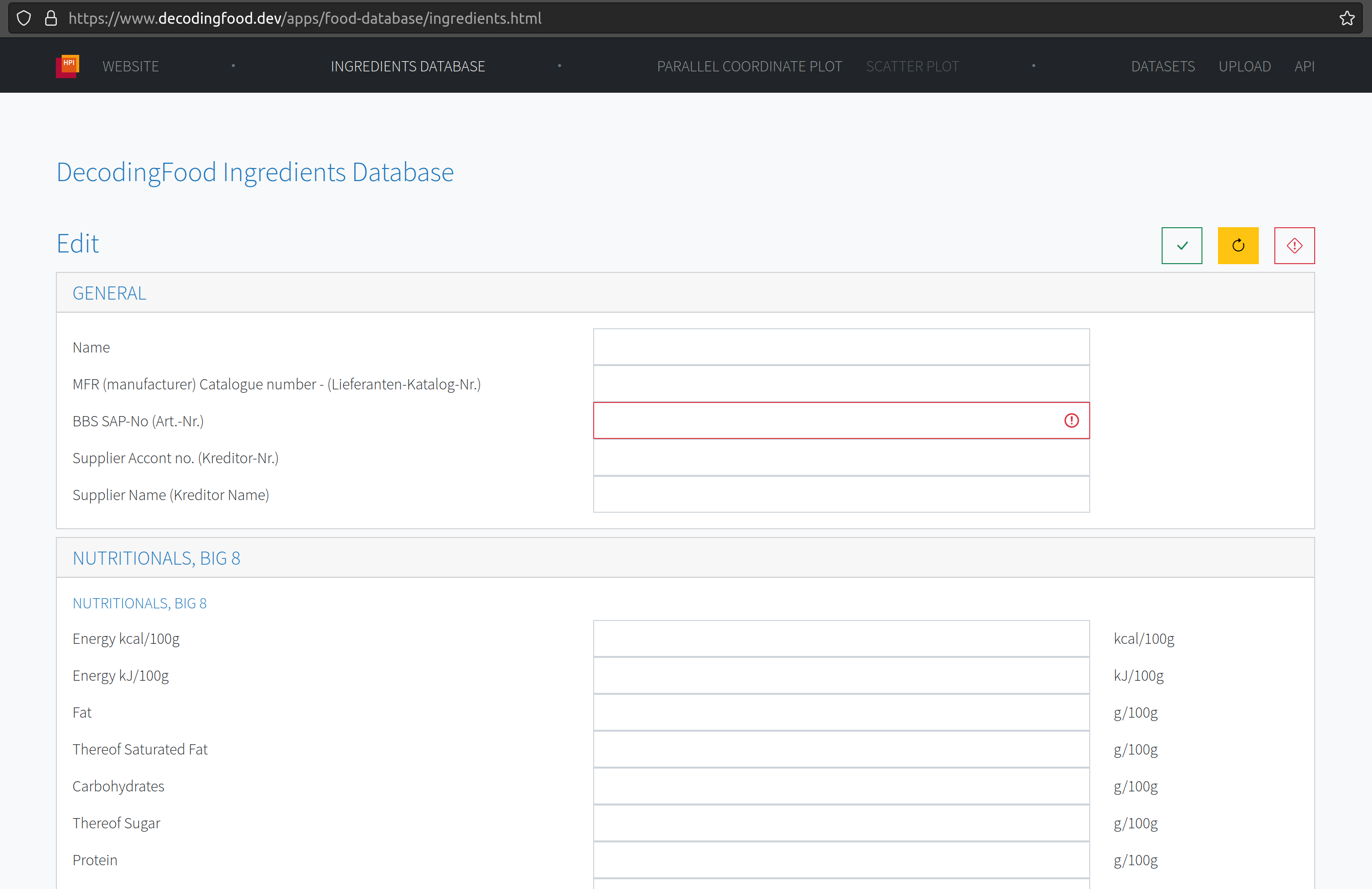 Über die gelben Schloss-Buttons können die Felder innerhalb der zugehörigen Gruppe bearbeitbar geschaltet werden. So bearbeitete Werte werden innerhalb der DecodingFood Plattform verändert, aber an keiner Stelle mit der SAP-Plattform zurück synchronisiert.