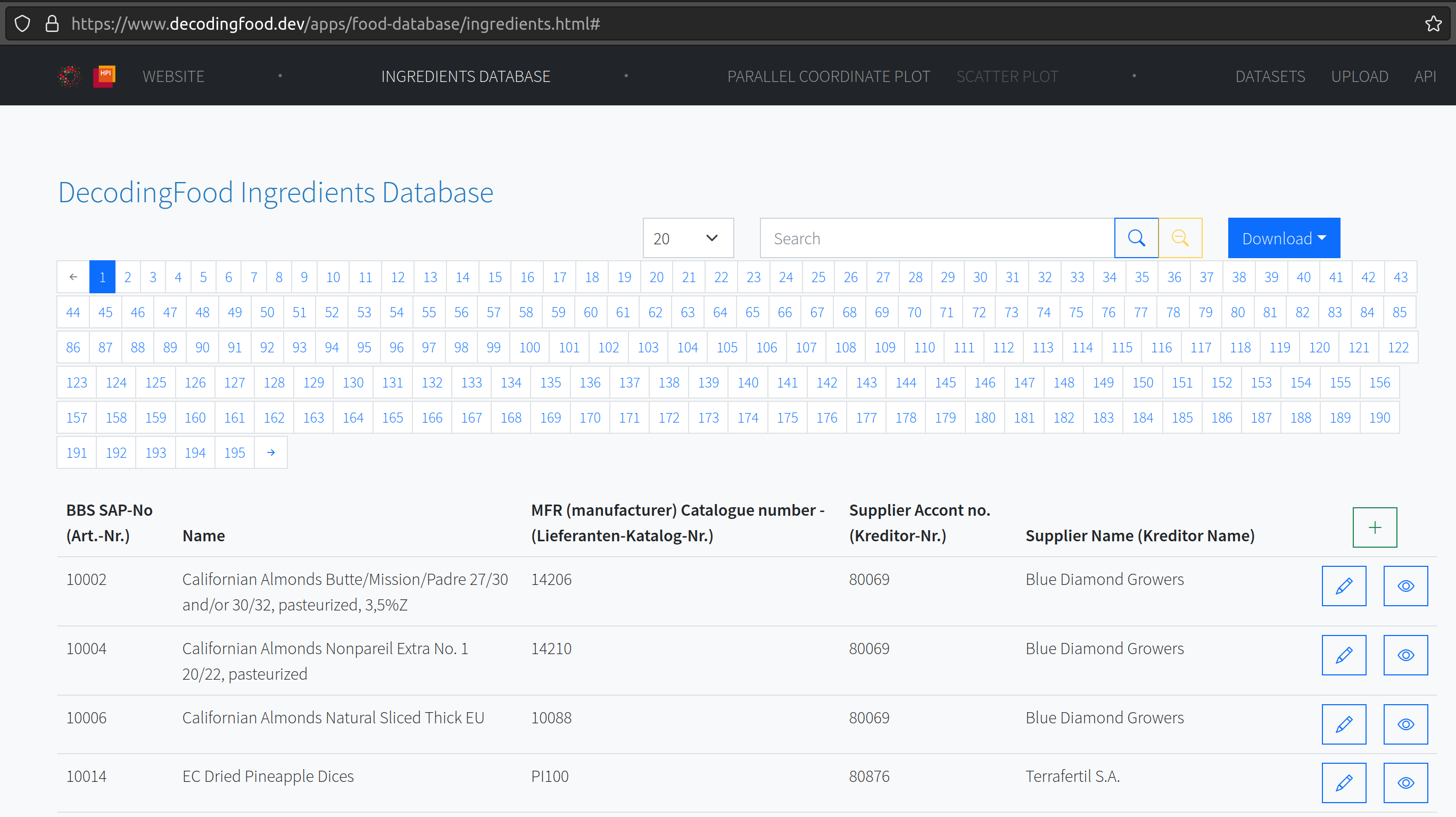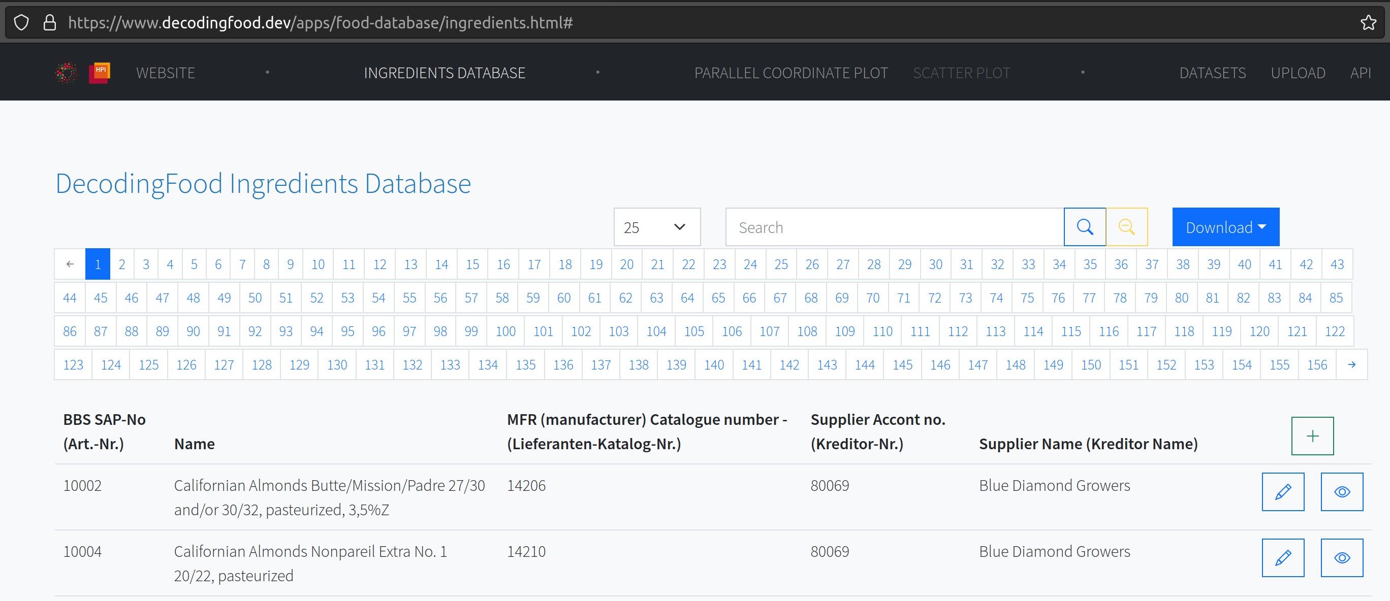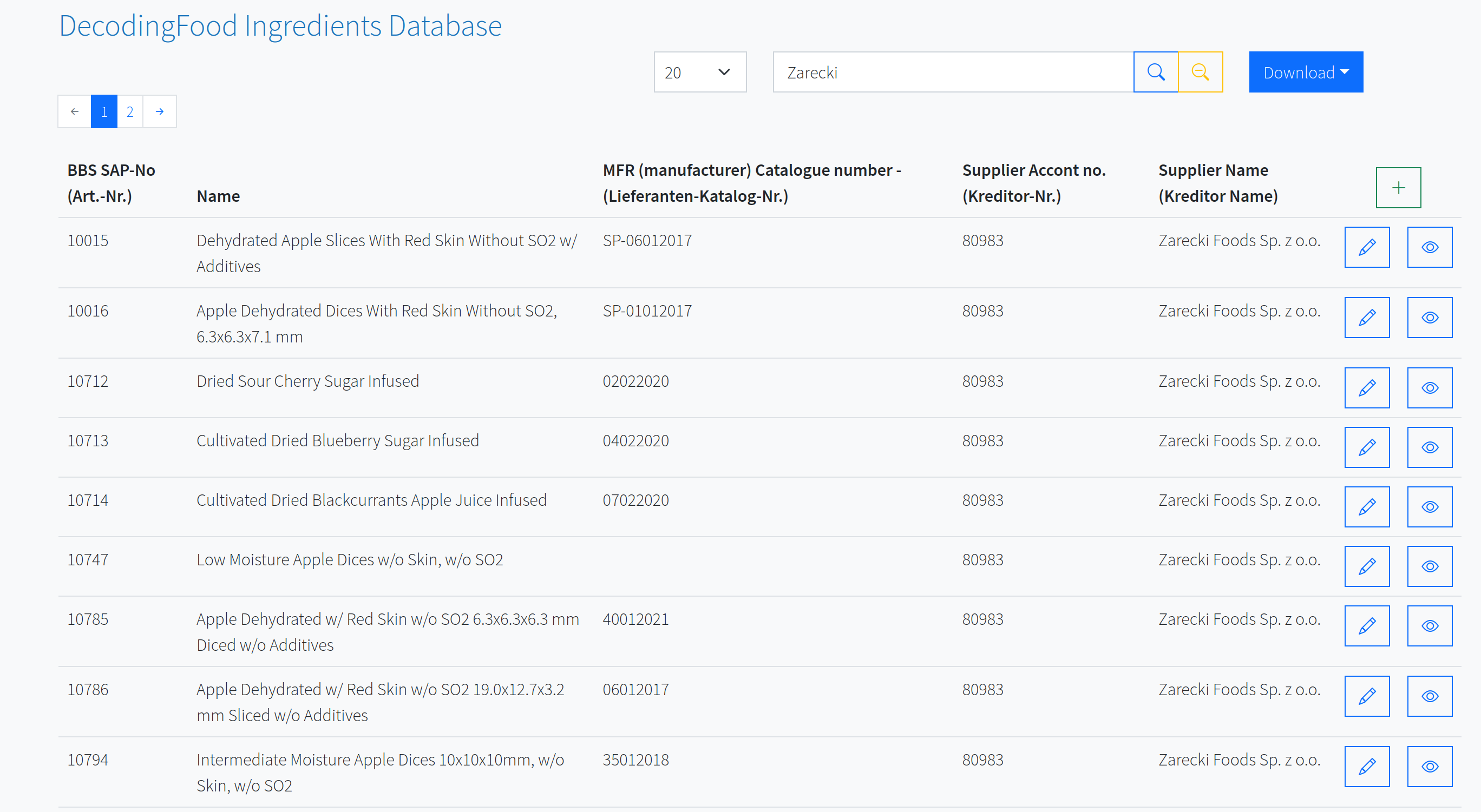 Übersicht der Zutatendatenbank zur manuellen Bearbeitung. Es werden 20 Zutaten pro Seite angezeigt (konfigurierbar über Dropdown). Über der Tabelle kann durch die Seiten navigiert werden. Ebenso können über das grüne Plus in der Titelzeile der Tabelle neue Zutaten angelegt werden (keine Synchronisation mit SAP, jetzt eher als Testzweck zu verstehen).