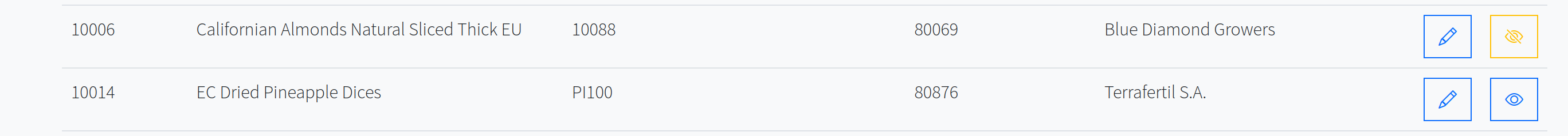 Pro Zeile in der Tabelle gibt es neben dem Editieren-Button die Sichtbarkeit eines Artikels in Analysen und Visualisierungen, die mit einem Klick auf das Auge gewechselt werden. Ein blaues Auge bedeutet “sichtbar” (lies: wird in Analysen und Visualisierungen beachtet und integriert); ein durchgestrichenes gelbes Auge bedeutet “unsichtbar” (lies: es wird entsprechend nicht beachtet und nicht integriert). Der Editier-Button öffnet ein separates Dialogfeld zum Editieren der Zutat (siehe “Benutzeroberfläche - Zutat Editieren”).