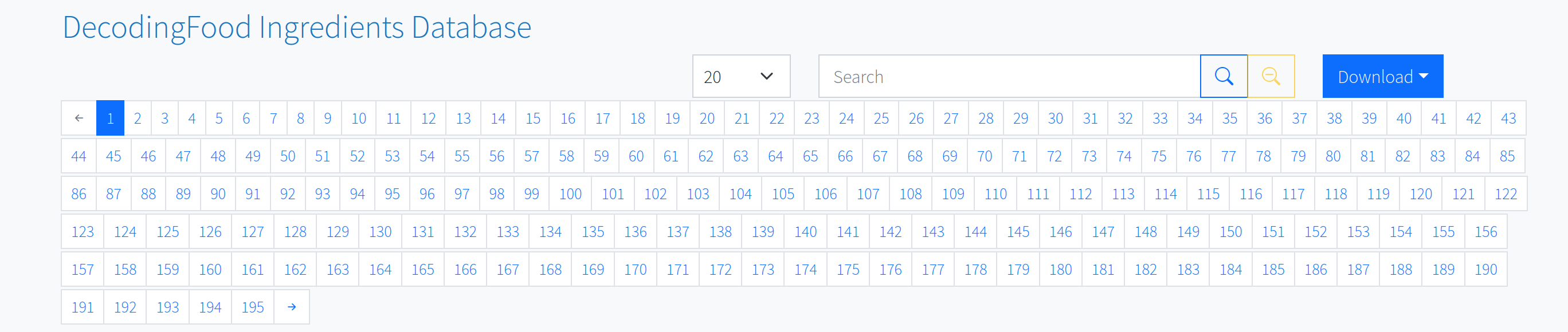 Die Bedienelemente für die Einträge pro Seite, der Stichwortsuche und der Seitennavigation ergeben kombiniert die aktuell anzuzeigenden Zutaten in der Tabelle. Eine Änderung der Einträge pro Seite zieht eine Aktualisierung der Seitennavigation nach sich.